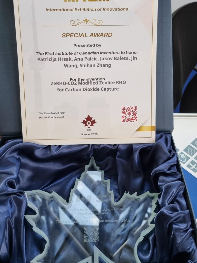 Patricija Hršak, Ana Palčić, Jakov Baleta, Jin Wang, Shihan Zhang: ZeRHO-CO2: Modificirani zeolit RHO za učinkovito hvatanje ugljikovog dioksida – osvojena srebrna medalja i Special Award presented by The First Institute of Canadian Inventors.
